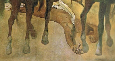 Pero sigamos analizando las similitudes entre la pintura de Rousseau y la de Dalí, debido a que las casualidades no terminan con la ramita partida en dos. ¿No estaba empuñando una espada el brazo que aparece detrás del caballo de Dalí?